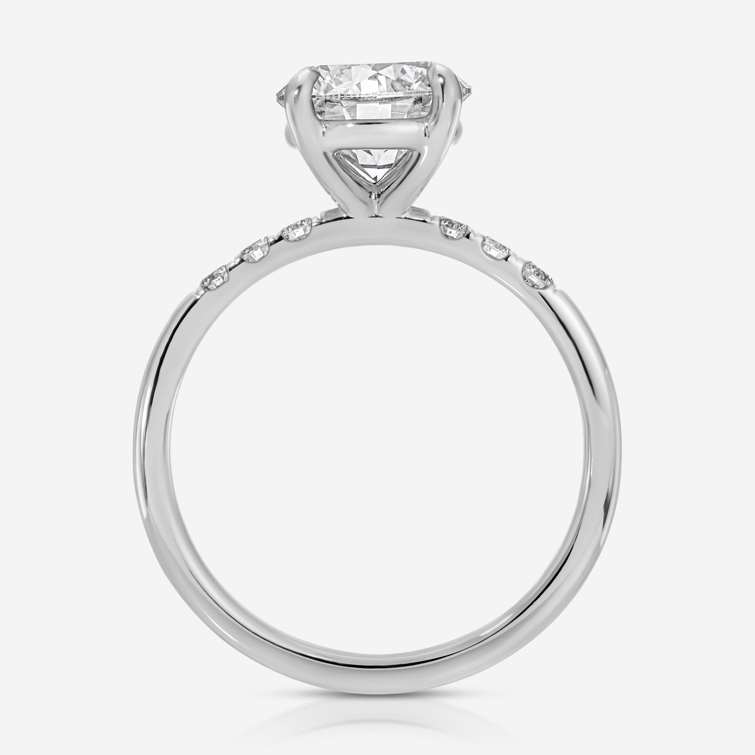 Our Molly Solitaire Engagement Ring features 6 pavé stones, 3 on each side of the center stone. The perfect option if you're torn between a plain or pavé band. Shown here with a 2.01 carat round brilliant center stone and a 14k white gold setting.
